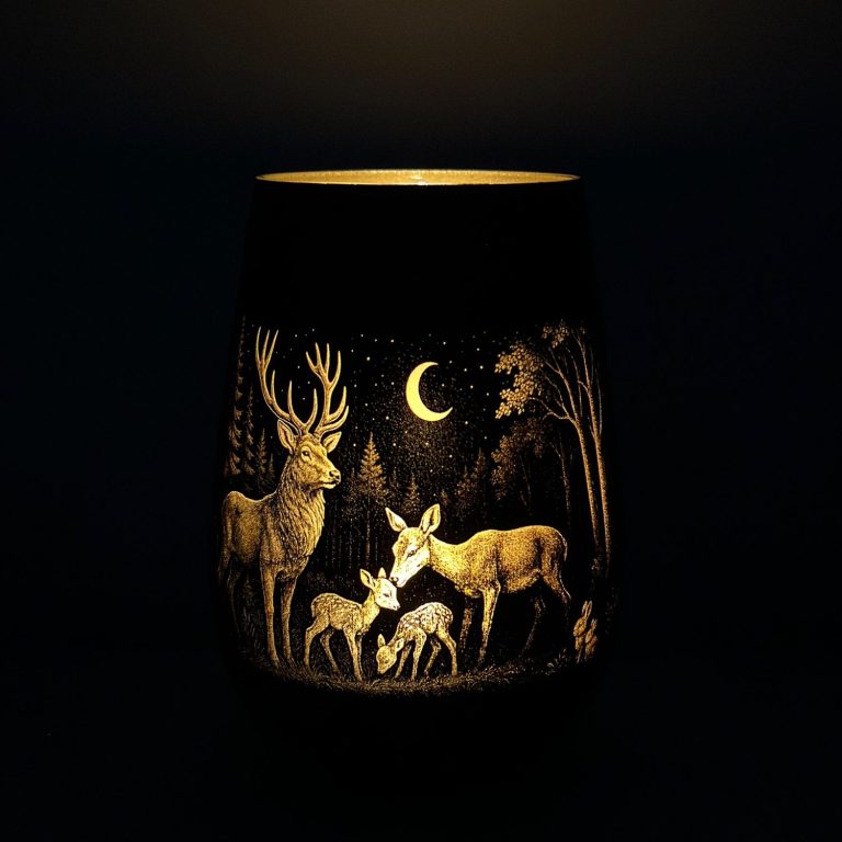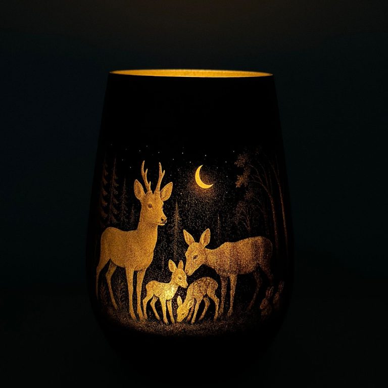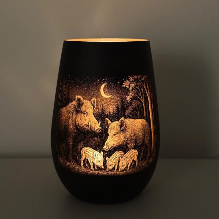 Die Motive sind inspiriert von der Natur – ob Rehe im Wald, Hirsche unter dem Sternenhimmel oder Wildschweine im Mondschein. Jedes Windlicht ist ein besonderer Blickfang und ein Unikat mit Charakter.